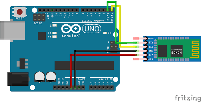 بعد أن تم تحميل الكود على اللوحة ، افصل الطاقة. بعد ذلك ، قم بتوصيل وحدة Bluetooth بالدائرة كما هو موضح أعلاه: