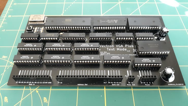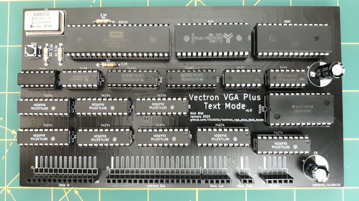 يوجد هنا رسم Arudino يمكن استخدامه لكتابة الأحرف باستخدام وضع النص. ملفات تصميم KiCad متوفرة هنا. ستحتاج أيضًا إلى محول Vectron VGA Plus VGA ، والذي تم تصميم وضع النص للعمل معه.