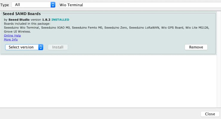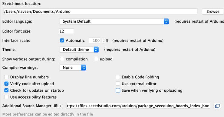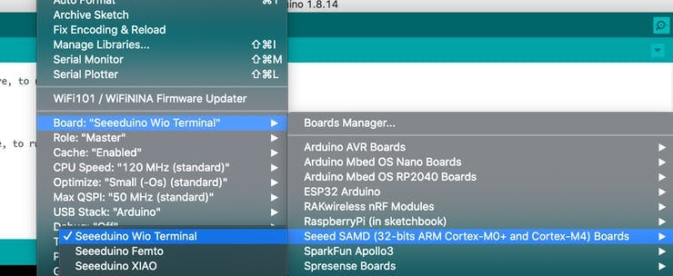 تم تطوير التطبيق وتصنيفه ووميضه باستخدام Arduino IDE. يرجى تنزيل أحدث إصدار من Arduino IDE واتباع التعليمات للتثبيت من هنا: https://www.arduino.cc/en/software. لتثبيت مكتبة Wio Terminal board ، افتح Arduino IDE ، وانقر فوق ملف> تفضيلات ، وانسخ عنوان URL أدناه إلى عناوين URL الإضافية لـ Boards Manager: