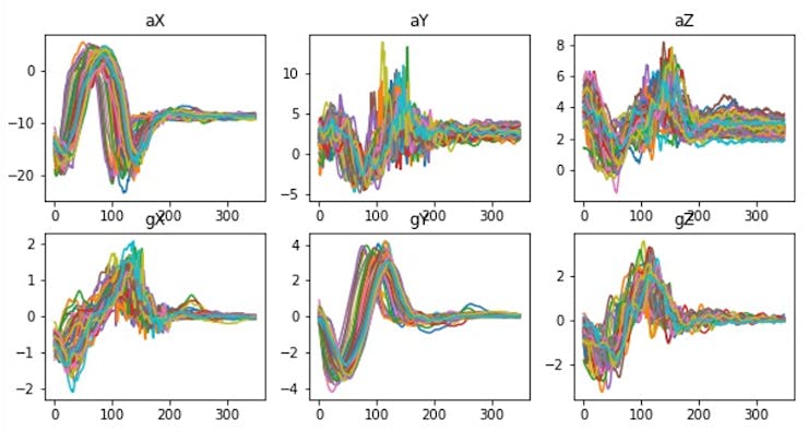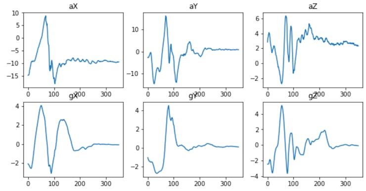بجمع بيانات التسريع والجيروسكوب الخام من MPU6050. لقد قمت بتعيين عتبة تسريع 2Gs لاكتشاف وقت بدء إيماءة ما ، وبعد ذلك أقوم بجمع 350 عينة ثابتة ، تقابل حوالي ثانيتين ، لجعلها متسقة وسهلة الإدخال في نموذج TensorFlow لاحقًا.