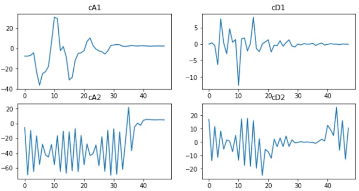 تتكون البيانات الأولية من IMU من 350 عينة بحيث يمكنها التقاط الحركة بأكملها ، ومع ذلك ، لا نحتاج حقًا إلى العديد من العينات لالتقاط الجوهر العام للحركة بشكل كامل. وهنا يأتي دور التحويل المويجي. ما يفعله هو الحفاظ على شكل الإشارة ، مع تغيير امتدادها الزمني ، مما يقلل بشكل أساسي من عدد العينات ، مع فقدان ضئيل للإشارة المفيدة. (cA1، cD1) تكون نتائج التحويل المويجي متجهين: أحدهما بمعامِلات تقريبية ، والآخر بمعامِلات تفصيلية. يضاعف هذا عدد الميزات المتاحة للتصنيف ، عن طريق تقسيم الإشارة إلى إشارتين منفصلتين. يمكننا أيضًا إنشاء المزيد من الميزات باستخدام موجات مختلفة (cA2 ، cD2).